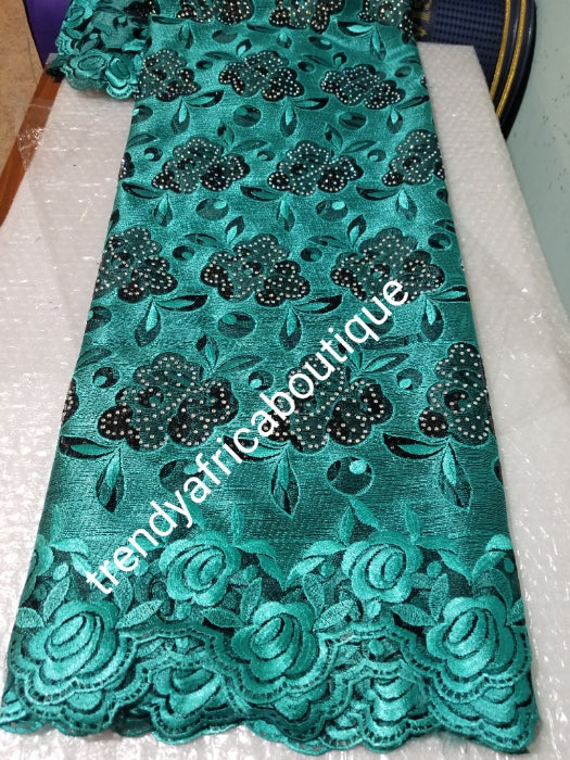 Luxurious Beautiful teal Green embriodery net French lace fabric Swiss Quality lace embellished with crystal stones all over. Sold per 5yds. Nigerian french lace fabric. Rich quality for wedding dress