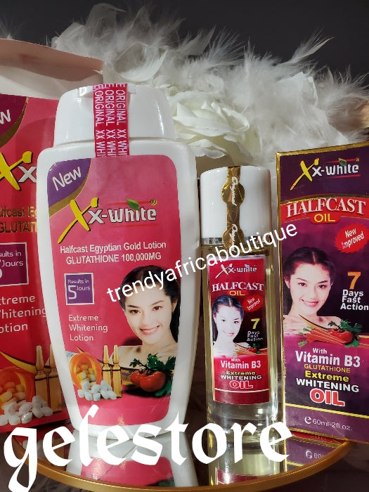 4pcs set: XX- white Halfcast Egyptian Gold body lotion, half cast oil, face cream & perfect skin tube cream 5 days action. vitamin B3, glutathion, Albutin,glutathione. Extra whitening set