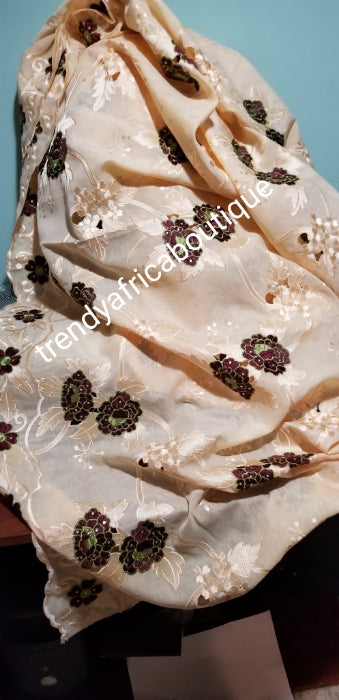 Classic Double Organza African Lace fabric. Wine/green Embriodery work on Beige fabric. Sold per 5yds. This is a Clearance item. Best price for a quality fabric
