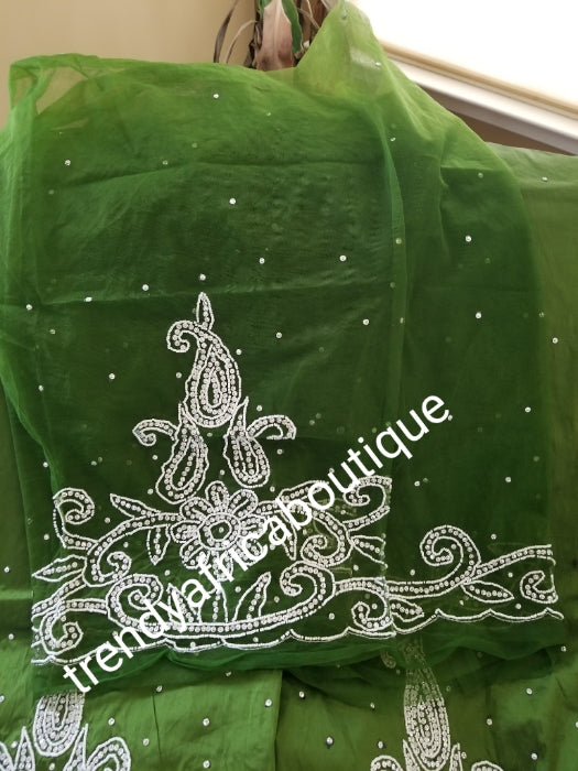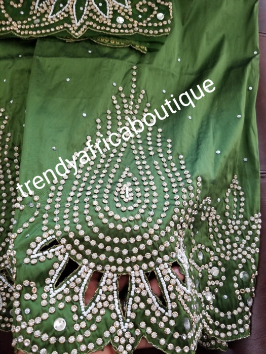 Clearance: hand stoned Silk George wrapper in beautiful olive green and white stoned design. Nigerian/igbo/Delta Bridal george wrapper. 5yds + 1.8yds net matching design for blouse combination. Sold as a set