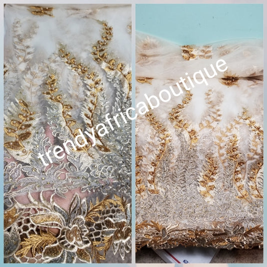 • Clearance:. Classic Embriodery Net  beaded and stoned George  lace fabric. Original quality. Sold per 5yds. Beige/Gold embriodery. African French lace/George wrapper.