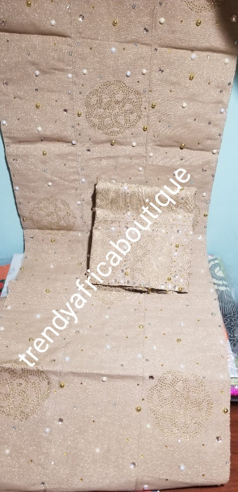 Clearance:. Classic Embriodery Net beaded and stoned George lace fabric. Original quality. Sold per 5yds. Beige/Gold embriodery. African French lace/George wrapper.