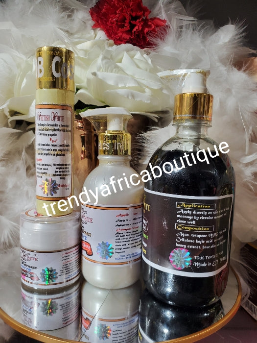 4pc perfect combo: whitish White exclusive Natural fairness body milk 250ml, serum/oil 50ml, + face cream 60g.& black shower gel. 100% response of dark sports.💯 AUTHENTIC