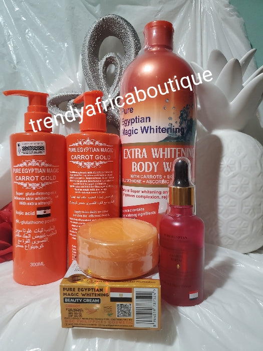• 5pcs set: Pure Egyptian magic extra whitening body lotion 2 bottles, body wash, serum & face cream With carrots extracts, ascorbic acid,  glutathione& egg york