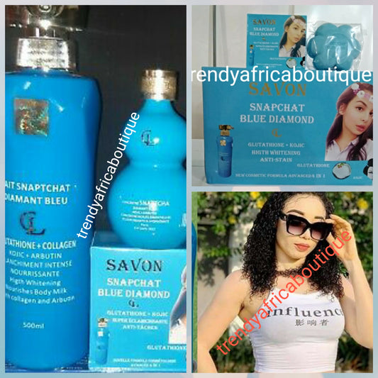 Lait Snap chat diamond blue body 3pc set. lotion 500ml, soap, and serum. Achieve uniform stainless and natural whitening skin glow with modern whitening natural ingredients. Glutathion + collagen. 100% satisfaction