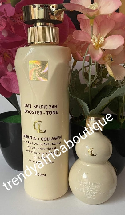 3pcs set of Lait selfie 24h booster tone body lotion 500ml, soap, and serum. Achieve uniform stainless and natural whitening skin glow with modern whitening natural ingredients. Glutathion, Arbutin + collagen. 100% satisfaction