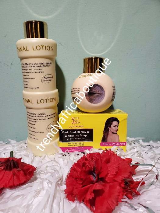 Final lotion combo set. New advanced formula contains plant extracts that evens and maintain your natural skin tone. gently fades away dark spots, wrinkles, age spots and marks. Body lotion 500ml, face cream, & soap.