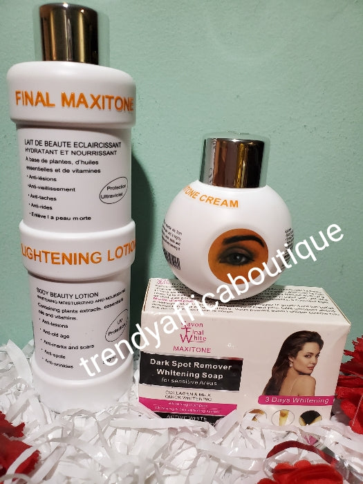 • Original final Maxitone lotion set: lotion 500ml,  face cream and soap 200g. formulated with natural ingredients + plant extracts. Whitening/brighten the skin safely. 500ml body lotion.  You will be happy with your skin!