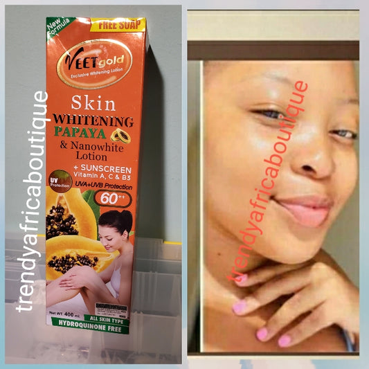 • Veet gold exclusive whitening body lotion, papaya & nano white with free soap. Body lotion 400ml x1. HYDROQUINOUN FREE