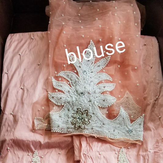 • Sale sale: Peach Premium Raw Silk George wrapper fabric, quality Hand Stoned work for Nigeriasn women ceremonies. Sold 5yds + 1.8 Yards net blouse fabric