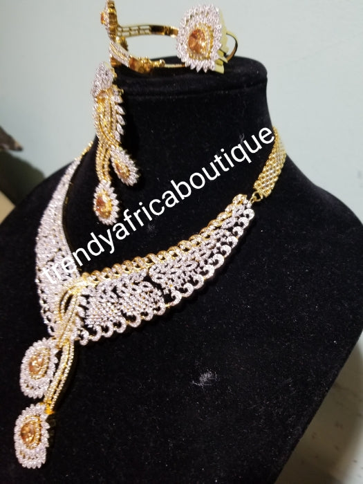 New arrival of 2pcs set of 22k Electroplated high quality CZ diamond stones in white/gold. Quality stone setting. Hypoallergenic plating. You can count on our quality jewelries. Beautiful Bridal jewelry set