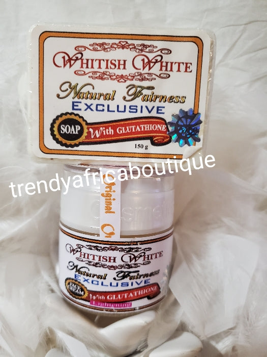• 5Pcs set: New packaging  EVOB whitish White exclusive Natural fairness body milk 250ml, whitish white strong serum, face cream, face soap & shower gel. Whitish White black shower gell. combo for a healthy flawless complexion