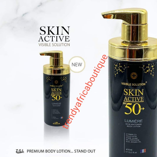 • Visible Solution skin Active whitening body lotion with vitamin C, glutathion, kojic acid, snail slime, AHA, +argan oil. 400ml. Super effective Skin repair whitening body lotion with Spf50