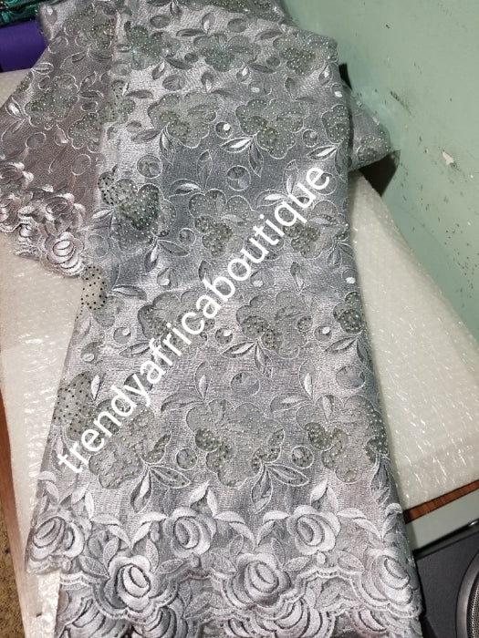 Luxurious Beautiful silver embriodery net French lace fabric Swiss Quality lace embellished with crystal stones all over. Sold per 5yds. Nigerian french lace fabric. Rich quality for wedding dress