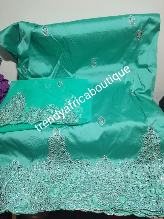 • Back in stock: Mint green embriodery George fabric. Top quality Indian-George for making Nigerian/African party dress. 5yds silk George + 1.8yds matching net blouse. Contact us if you are interested in Aso-ebi order