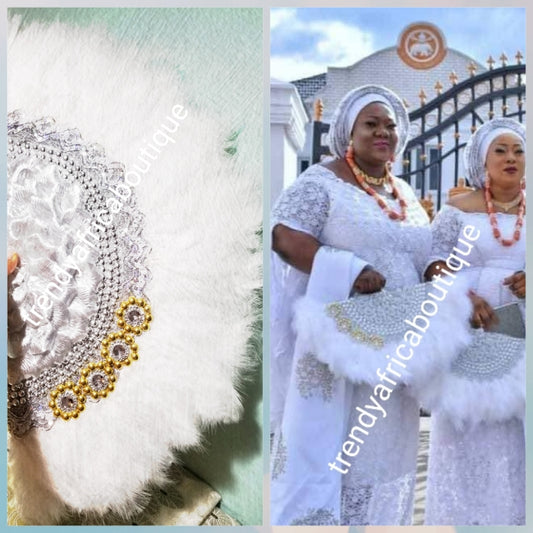 • Back in stock. Pure White/silver Feather hand fan. Large moon shape hand fan Nigerian  Bridal-accessories front and back middle design with beads and flower petal. Limited quantity. 25" long + 14" wide. Small handle to hold your fan. Very class