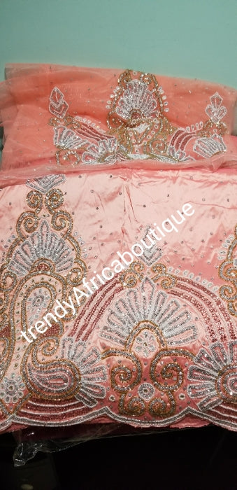 Sale sale: Peach Premium Raw Silk George wrapper fabric, quality Hand Stoned work for Nigeriasn women ceremonies. Sold 5yds + 1.8 Yards net blouse fabric
