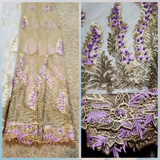 • Beige/lilac Net French lace fabric, Luxery Embriodery African french lace fabric. Beaded and stoned to perfection. Sold per 5yds price is for 5yds. Beautiful border handcut embriodery work