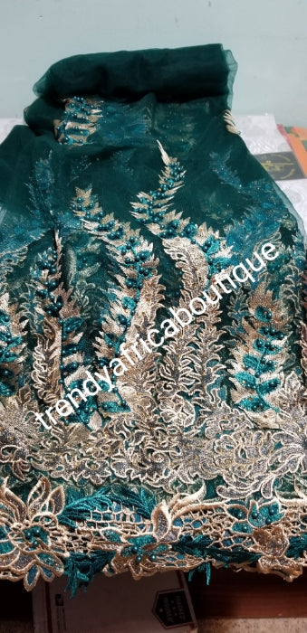 • Green/gold Net French fabric, Luxery Embriodery  African french lace fabric. Beaded and stoned to perfection. Sold per 5yds price is for 5yds. Beautiful border handcut embriodery work
