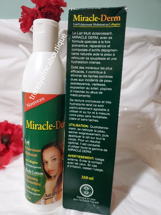 • Miracle-Derm lightening & moisturing body lotion with Collagen,gradually lightens black spots effectively and unify your complexion, 350ml. X1 bottle.