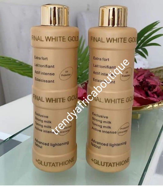• Original final white Gold lotion with Glutathion 500ml, advance toning milk   formulated with natural plant extracts. Fast acting brightening the skin safely. 500ml body lotion.