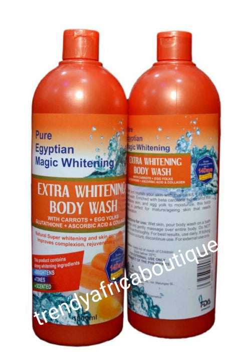 Pure Egyptian magic gold extra whitening shower wash. With carrots + egg yolk and glutathione, ascorbic acid + collagen 1000mx1l