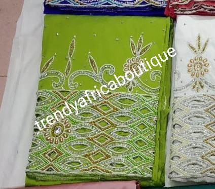 • Sale: Quality Lemon Green Taffeta Silk George wrapper: hand cut border beaded and silver crystal stoned for Nigerian traditional wedding/party outfit. Come as 2.5yds+2.5yds +1.8yds matching net for blouse. best Indian-george.