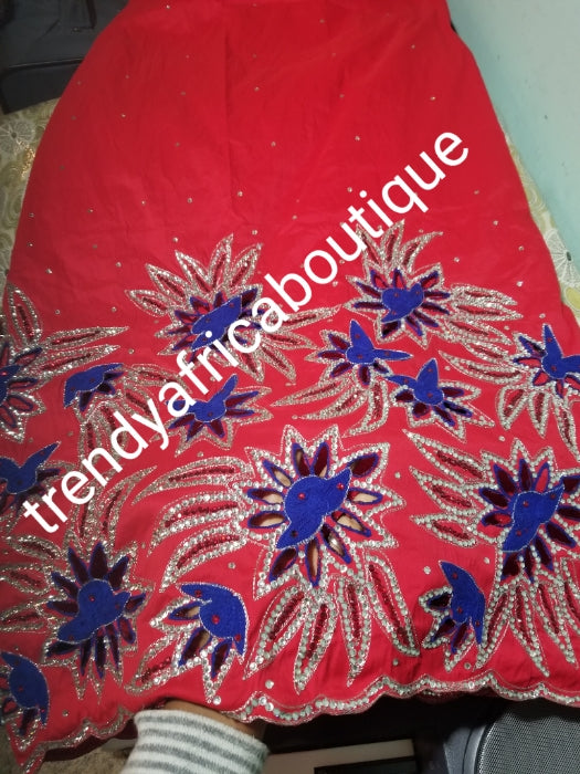 Sale: Quality Red Taffeta Silk George wrapper/ royalblue contrast blouse. hand cut border beaded and silver crystal stoned for Nigerian traditional wedding/party outfit. Come as 2.5yds+2.5yds +1.8yds matching net for blouse. best Indian-george.