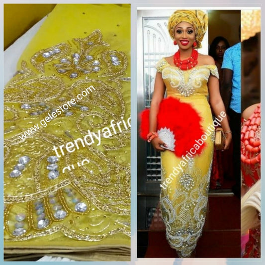 Ready to Ship: Gorgeous Igbo Traditional Bridal outfit- quality yellow net George wrapper and matching net for blouse. embellished with dazzling Crystal stones all over. 2 wrapper + 1.8yds net for blouse. Sweet yellow net Ideal for making Celebrant outfit