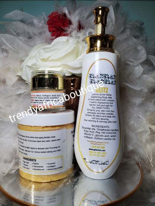 • 3pcs. Great Results: Glitzluxury Snowwhite anti-aging Molato Soap, Snow white 2n1 lightening body Lotion 🔥🔥🔥👌. & the face cream! Whitens & Treatment combo!