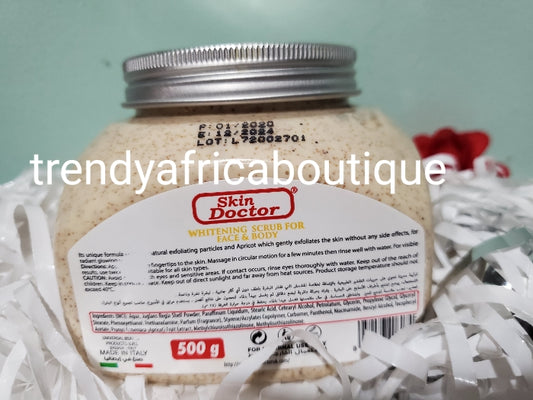 • Skin Doctor face and body whitening  apricot scrub for all skin type, gently exfoliates and remove dead skin cells. 500g jar.