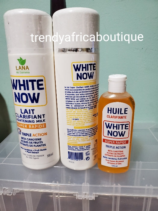 Bonus buy: White Now Lait Clarifiant triple action whitening body lotion 500ml bottl + Serum + soap. Is advisable to mix the serum thoroughly into the lotion for best results.