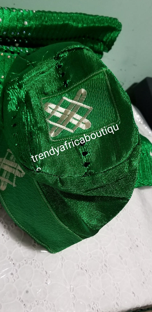 • New arrival Green Nigerian Agbada men-Cap made with Aso-oke with embroidery. Size is 23", & 24"  inches. Measure your head circumference before you place your order!!