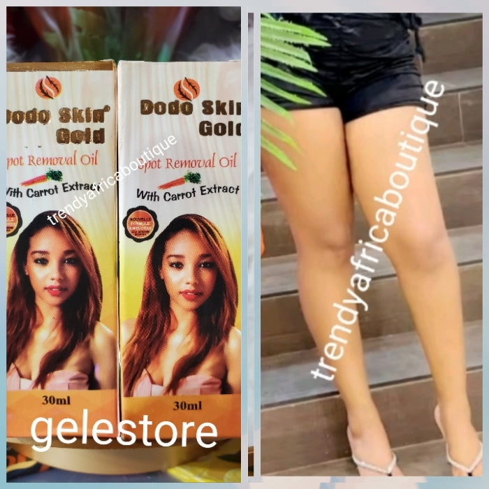 Dodo skin gold black spots remover is formulated with pure carrot extracts uniquely formulated to  gradually lighten your  body by fading away dark spots, age spots and more. freckles, dark patches and stretch marks due to pregnancy. Given you over all even tone complexion and a youthful l