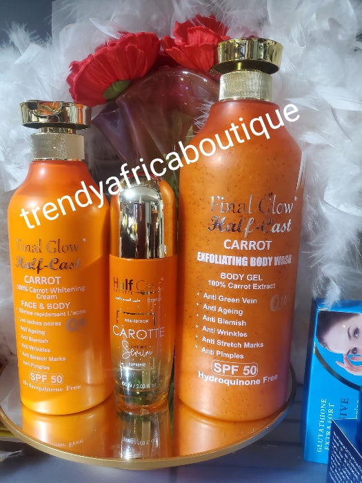3pcs. Perfect combo👌 Final Glow half-cast carrot whitening body lotion, shower gel, & serum 💯 carrot for face and body. Spf 50. Super effective