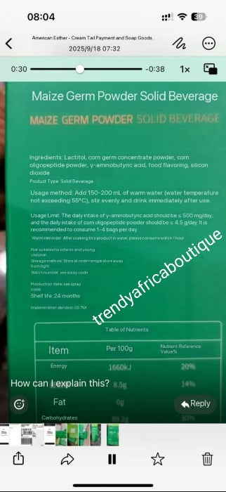 This is a nutritional maize germ drink powder meant to be mixed with warm water and consumed as a health supplement.