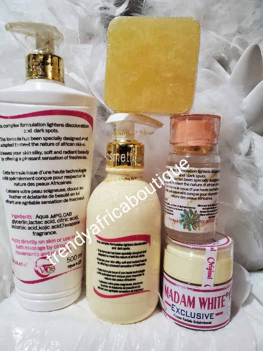 • 8ps COMBO DEAL of  Madam white Exclusive flawless skin whitening, brightening  Body Lotion 250ml x 2 serum 60ml x 2,face cream, 1 shower gel, 1 Q10 halfcast soapUniversal corrector, multi action set.