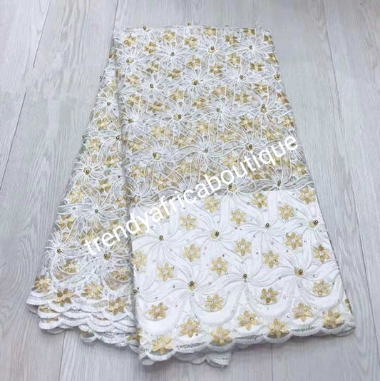 • Latest design: African French lace fabric embellished with beads & stones all over to perfection. Sold per 5yds. Nigerian Bridal lace fabric white/gold