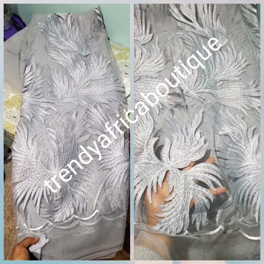 New arrival silver/Gray classic French lace design. Swiss quality embellished with crystal stoned. Sold per 5yds. Nigerian french lace fabric. Rich quality for wedding dress. For making Nigerian party dresses.