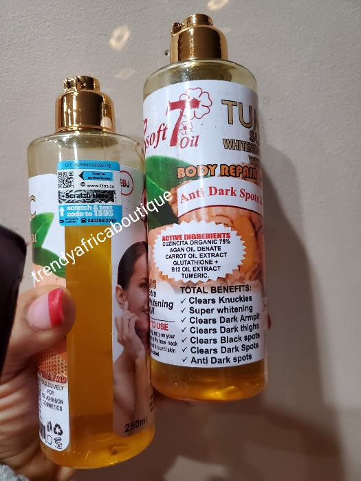 2pcs. Banger👌👌: Soft 7 Turmeric whitening exfoliating & Glowing oil. Based on Turmeric + Honey extracts. 7 days action. Anti dark spots, anti aging 250ml x 1 bottle sale! Face & body oil.