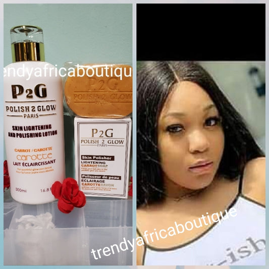2pcs. Combo: P2G (polish to Glow) paris skin lightening and polishing body lotion with carrot extracts. Anti stretch marks and scars. Body lotion 500ml + exfoliating combo