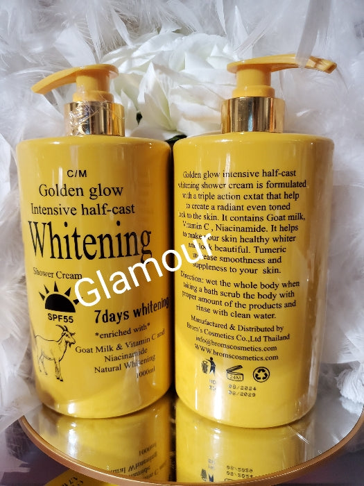 • 2 bottles of Golden Glow Intensive Halfcast whitening shower gel Enriched with goat Milk, vitamins C & Niacinamide 1000mlx 2 spf 55