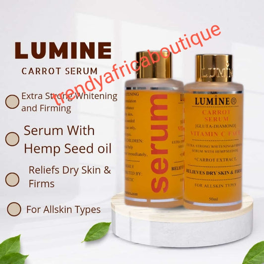 • 3pcs. Set:  Lumine Carrot face and body lotion, shower gel and Lumine strong serum.Extra strong whitening 3 in 1 with glutathione, carrot extracts + tomato. Spf 50. Firming and glowing