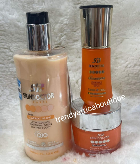 4pcs set: Skin Doctor Carrot Glow body lotion, shower gel, serum and face cream. Excellent combination for skin lightening and glowing naturally spf30. Use morning & night