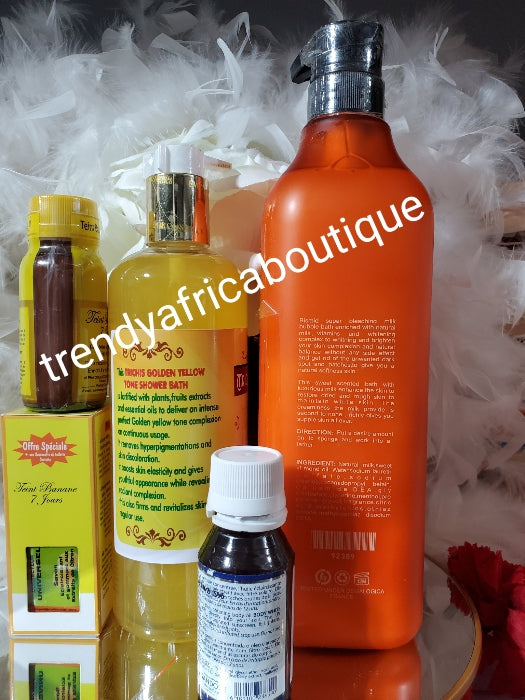 • DIY OSHAPRAPRA super whitening shower gel; 4pcs. Set. Bismid shower gel, Trichis golden shower bath, teint Banana stage 2 nourishes serum & body white oil 🔥👌👌