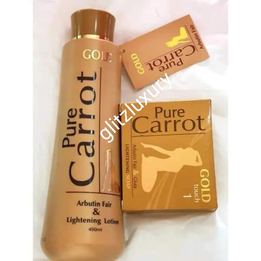 2pcs set: Pure Carrot Gold, Arbutin fair body lotion 450ml, & exfoliating soap. all skin types.