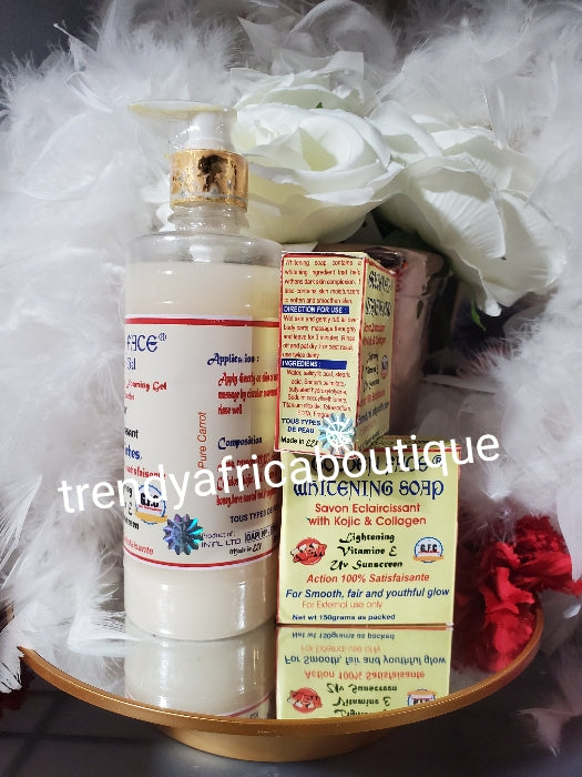 • 2pcs:Half cast carrot supreme lightening face cleanser & Half cast carotte supreme Restoring and glowing face cream, anti-wrinkle, anti spots. Vitamins E, carotte oil and kojic acid. 50g jar