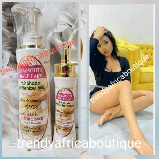 • New packaging set:  5pcs set  Dear White Half cast whitenizer body milk super strong 500ml; Face cream 75g, serum 100ml, Ultimate stong  peach body Scrub 350g Plus perfect balance tone lotion! WHOLSALE PRICES Available upon request!!
