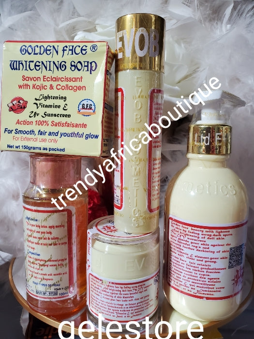 5pc Combo set: Original Golden face beauty milk 250ml, triple action face cream. Fades dark , serum 60ml, facial soap and essential oil combo. For all skin type.