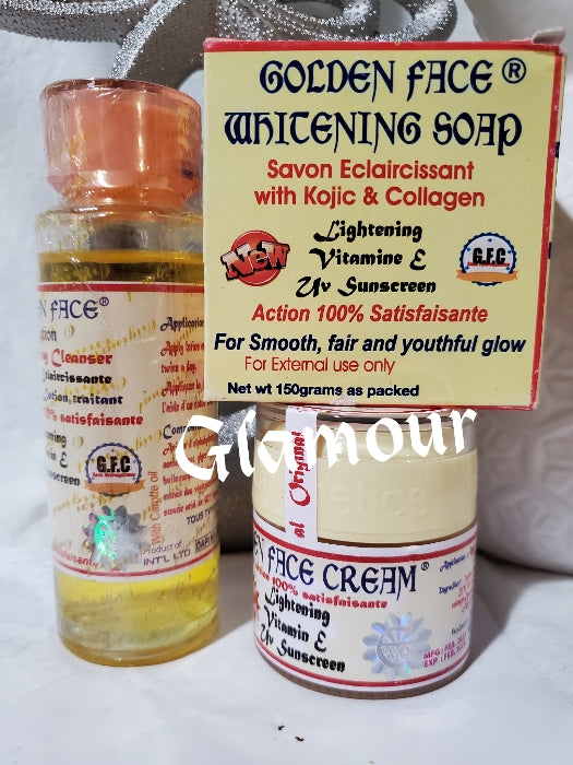• 3 in 1 Original Golden face triple action whitening face cream, lightening golden face cleanser + face soap. Fades dark spot, acne, pimples,  dark under eye from the face. For all skin type. Use day and night. Beware of FAKE!!!.